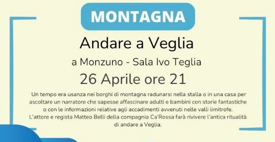 Festival narrativo del paesaggio. “Andare a Veglia” sbarca a Monzuno venerdì 26 aprile alle ore 21.00 presso la sala Ivo Teglia