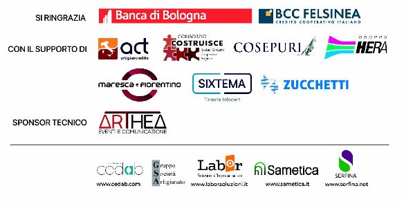 Per la realizzazione della sua assemblea, la CNA ringrazia la Banca di Bologna e Bcc Felsinea. L’assemblea è stata realizzata col supporto di Artigiancredito, Consorzio costruisce, Cosepuri, Hera, Maresca e Fiorentino, Sixtema, Zucchetti, Cedab, Gsa, Labor soluzioni d’impresa, Sametica, Serfina. Sponsor tecnico Arthea.