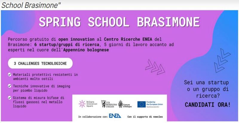 - Percorso di open innovation con ricercatori/dirigenti ENEA Brasimone, mentoring tecnico, workshop tematici, sessioni di networking e valorizzazione territoriale.