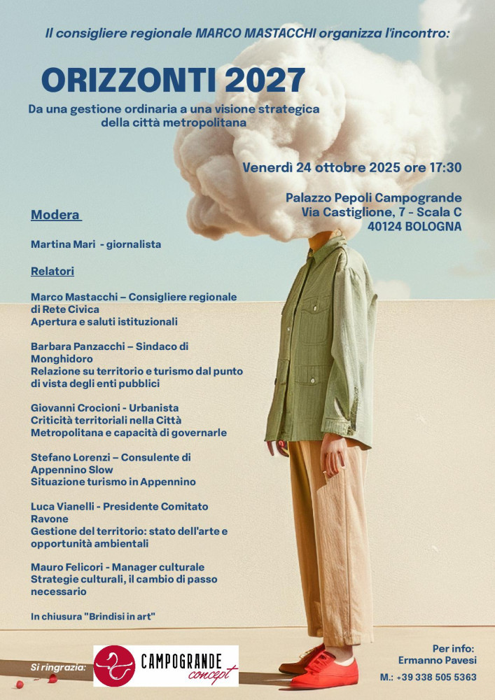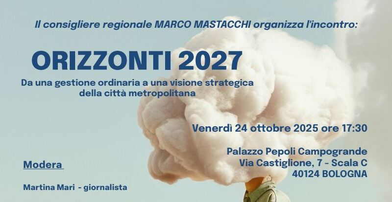 Si terrà venerdì 24 ottobre alle ore 17.30 presso Palazzo Pepoli Campogrande, Via Castiglione, 7 – Scala C a Bologna l’incontro promosso dal consigliere regionale Marco Mastacchi: “ORIZZONTI 2027 – Da una gestione ordinaria a una visione strategica della città metropolitana”, un appuntamento pensato per aprire un confronto concreto sul modo in cui viene amministrato il nostro territorio. Relazione su territorio e turismo dal punto di vista degli enti pubblici.