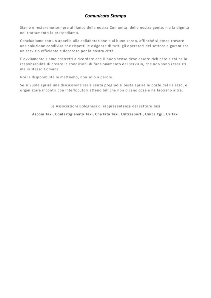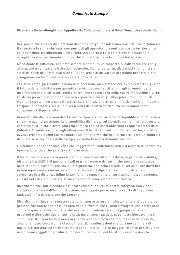 Bologna. Associazioni taxisti rispondono a Federalberghi. Comunicato stampa in allegato