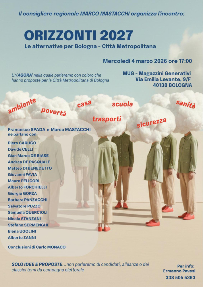 Si terrà mercoledì 4 marzo 2026 alle ore 17.00 presso MUG – Magazzini Generativi Bologna, Via Emilia Levante 9/F a Bologna il terzo degli incontri promossi dal consigliere regionale Marco Mastacchi del ciclo ORIZZONTI 2027, appuntamenti dedicati alle elezioni comunali di Bologna 2027, per discutere insieme quale futuro vogliamo per la Città Metropolitana di Bologna e aprire un confronto concreto sul modo in cui viene amministrato il nostro territorio.