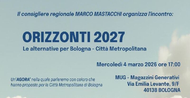 Si terrà mercoledì 4 marzo 2026 alle ore 17.00 presso MUG – Magazzini Generativi Bologna, Via Emilia Levante 9/F a Bologna il terzo degli incontri promossi dal consigliere regionale Marco Mastacchi del ciclo ORIZZONTI 2027, appuntamenti dedicati alle elezioni comunali di Bologna 2027, per discutere insieme quale futuro vogliamo per la Città Metropolitana di Bologna e aprire un confronto concreto sul modo in cui viene amministrato il nostro territorio.