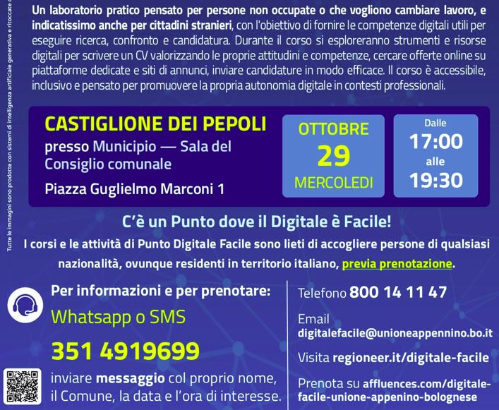 Mercoledi 29/10 dalle ore 17:00 si terrà presso la Sala consiliare del Municipio di Castiglione dei Pepoli il nuovo corso gratuito Digitale Facile dedicato al DIGITALE PER IL LAVORO.