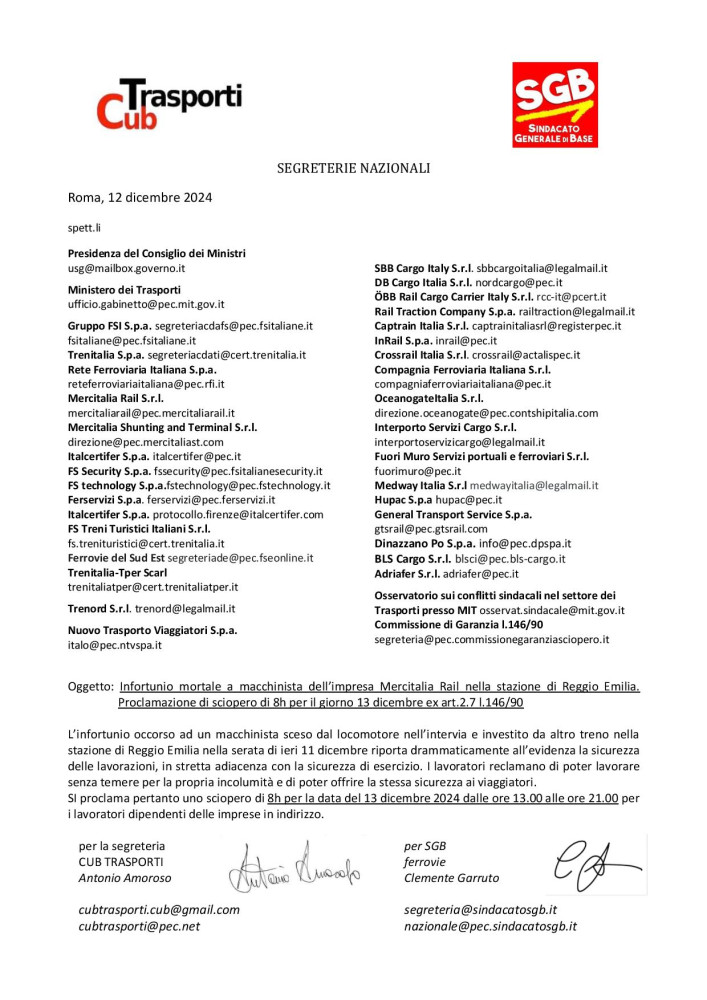 Si informa che oltre allo sciopero gia’ in vigore dalle ore 9 alle ore 13, e’ stato indetto un ulteriore sciopero, nella medesima giornata di domani 13 Dicembre 2024, dalle ore 13 alle ore 21 in seguito all’incidente mortale occorso nella giornata di ieri ad un macchinista nella stazione ferroviaria di Reggio Emilia. Vedi allegato