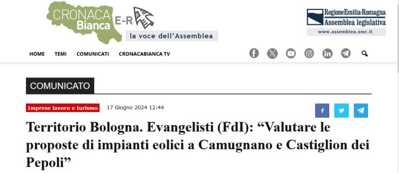 Evangelisti (FdI): “Valutare le proposte di impianti eolici a Camugnano e Castiglion dei Pepoli”