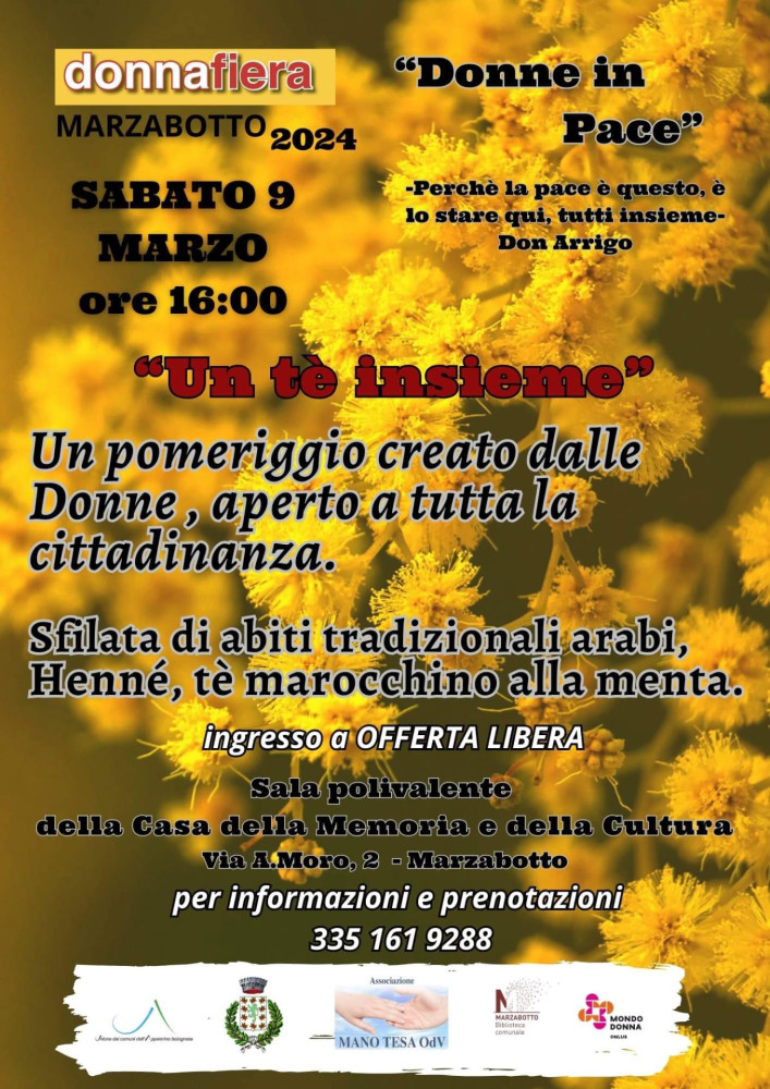 Ore 16:00 -18:30 “Un tè insieme”. Un pomeriggio creato dalle Donne, aperto a tutta la cittadinanza. Sfilata di abiti tradizionali arabi, Henné, te marocchino alla menta – Sala Polivalente Casa della Cultura e della Memoria