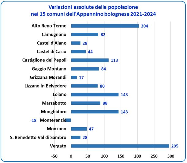 Migrazioni verticali: tra il Censimento 2021 e il 31 dicembre 2024 la popolazione residente nei quindici comuni montani e collinari è salita da 69.269 a 70.647, +2%. Le variazioni più significative hanno interessato Vergato (295 abitanti in più), Alto Reno Terme (204), Monghidoro e Loiano (143) e Castiglione dei Pepoli (113); significativi incrementi a Marzabotto (+88), Gaggio Montano (84), Camugnano (82) e Lizzano in Belvedere (80). L’unico comune in calo è Monterenzio: -18