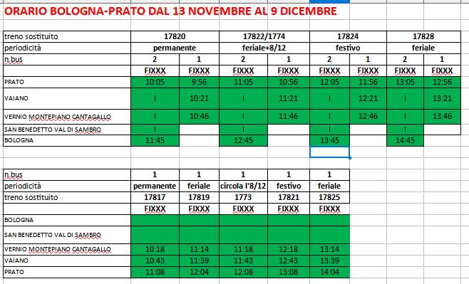 Nell’allegato BUS Prato-bologna 13 novembre – 9 dicembre i BUS in circolazione per sostituzione treni effettuati dalla data del 13 Novembre alla data del 9 Dicembre