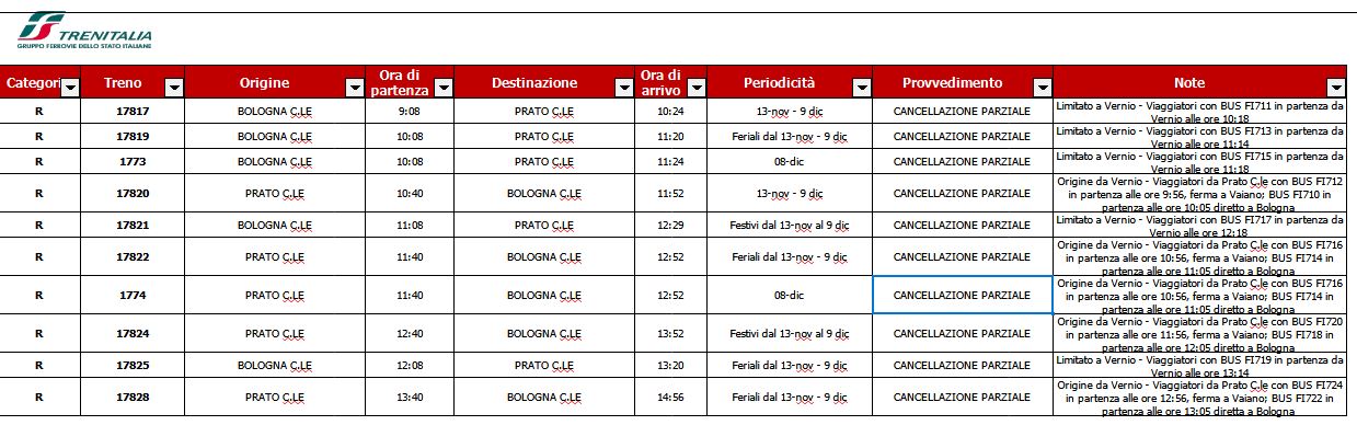 L’offerta ordinaria subirà le variazioni riportate nel file allegato (Programma variazioni Prato-Bologna 13 novembre 2023-9 dicembre 2023), i treni non indicati nel file circoleranno regolarmente.