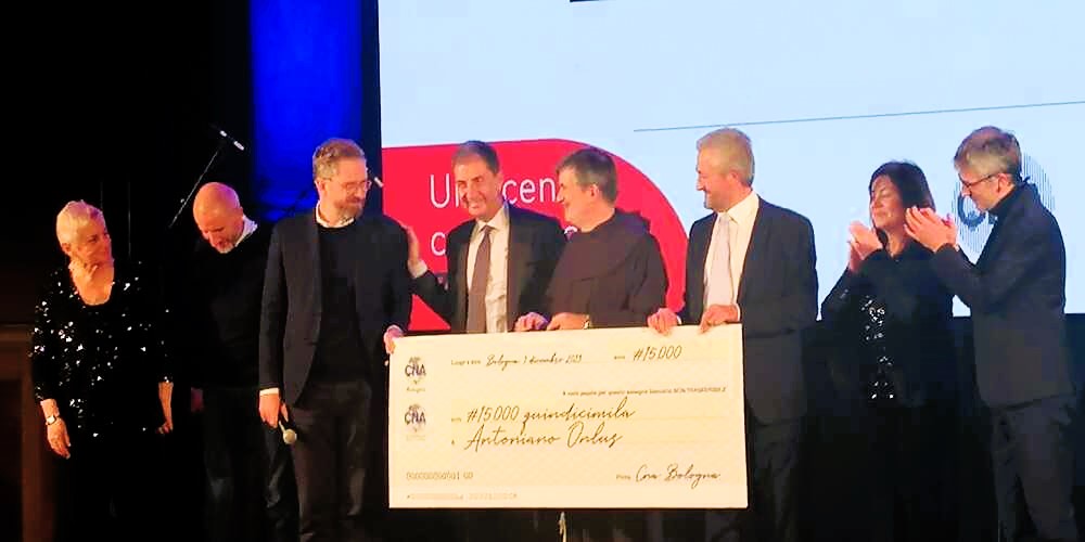 La “Cena col Cuore”, cena solidale organizzata da Cna a sostegno della Mensa di Antoniano onlus, ha raccolto 15.000 euro, che sono stati consegnati sotto forma di assegno simbolico a Fra Giampaolo Cavalli Direttore di Antoniano onlus.