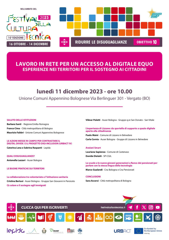 Buone pratiche per ridurre le diseguaglianze sociali realizzate attraverso la collaborazione in rete tra Lepida, Enti pubblici e ETS/OO SS. Nell’incontro verrà data voce ai soggetti del territorio che, intercettando i bisogni della cittadinanza, hanno dato vita ad esperienze di supporto sull’utilizzo del digitale volto alla riduzione del digital divide.