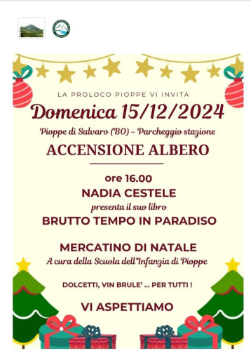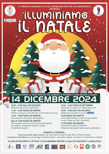 Il giorno seguente, sabato 14 dicembre, appuntamento a Marzabotto con “Illuminiamo il Natale” evento che era previsto per domenica 8 dicembre, rinviato a sabato 14 a causa del maltempo. Durante tutta la giornata tante bancarelle degli hobbisti, laboratorio dell’albero con personaggi e intrattenimento, cioccolata in tazza, vin brulé, tè marocchino e dolcetti. Trovate sulla locandina tutte le iniziative in programma in Piazza dei martiri e presso la Sala Polivalente.