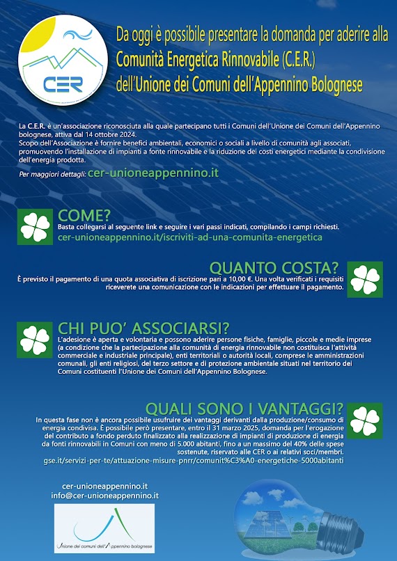 È ufficialmente aperta la possibilità di iscriversi alla Comunità Energetica Rinnovabile (CER) dell’Unione dei Comuni dell’Appennino Bolognese, un’associazione riconosciuta che riunisce tutti i Comuni dell’Unione.