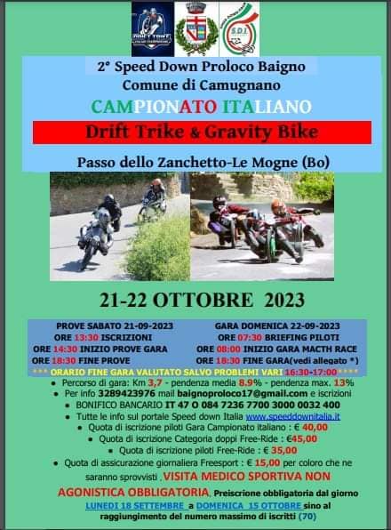 Anche per quest’anno si rinnova l’appuntamento dello Speed Down sport ecologico ed allo stesso tempo molto adrenalina con picchi di velocità che si aggirano a 80/85 km/h quest’anno sarà anche la finalissima della categoria Drift Trike mezzi a tre ruote e Gravity Bike mezzi a 2 ruote che sembrano vere moto da pista.
