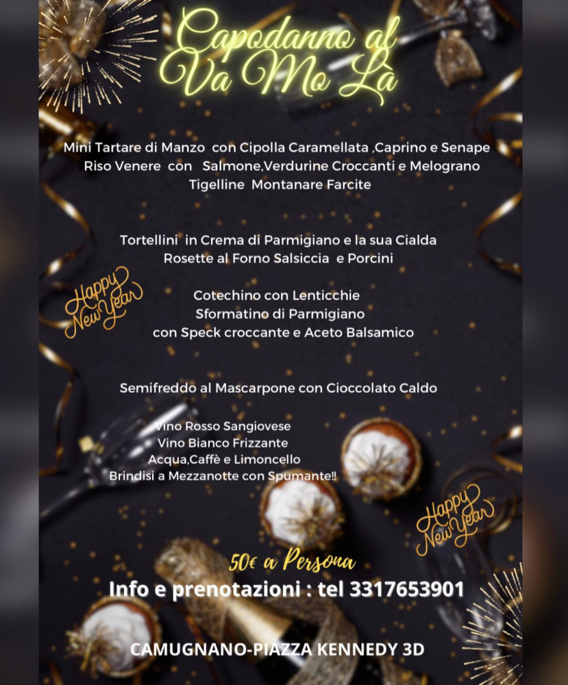 Alla Taverna Va Mo Là di Camugnano, in Piazza Kennefy, “Cenone di Capodanno”. Vedi Menù