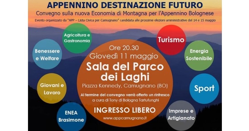 Evento organizzato da “APP – Lista Civica per Camugnano” candidata alle prossime elezioni amministrative del 14 e 15 maggio 2023 Affronteremo i grandi temi dell’economia di montagna con un approccio “a tutto tondo”: Agricoltura ed enogastronomia, Turismo, Sport, Energie sostenibili, ENEA – Brasimone, Imprese e artigianato, Giovani e lavoro, Benessere e welfare. Chairman: prof. Andrea Porcarelli (Professore di Pedagogia generale e sociale – Università di Padova)