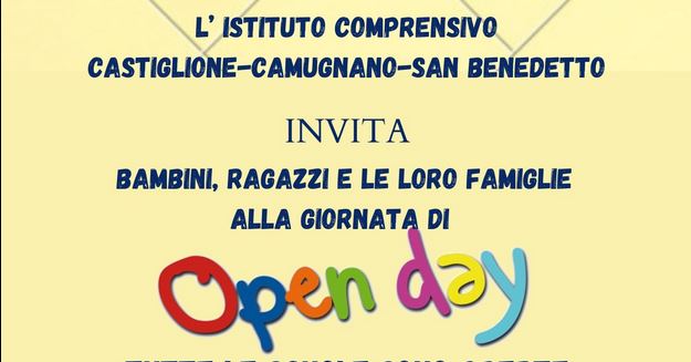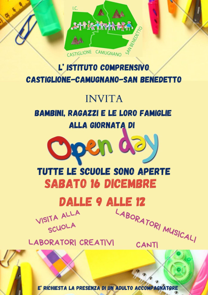 Dalle 9:00 alle 12:00 di questo sabato 16 dicembre tutti i plessi scolastici dell’Istituto Comprensivo Castiglione – Camugnano – San Benedetto saranno aperti: una bella occasione per far conoscere ai nuovi iscritti le scuole e l’offerta formativa.