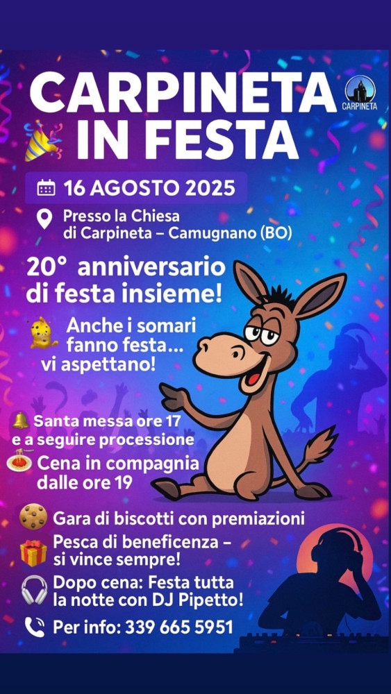 Sabato 16 agosto, a Carpineta di Camugnano “Carpineta in Festa”. Vedi Locandina in allegato