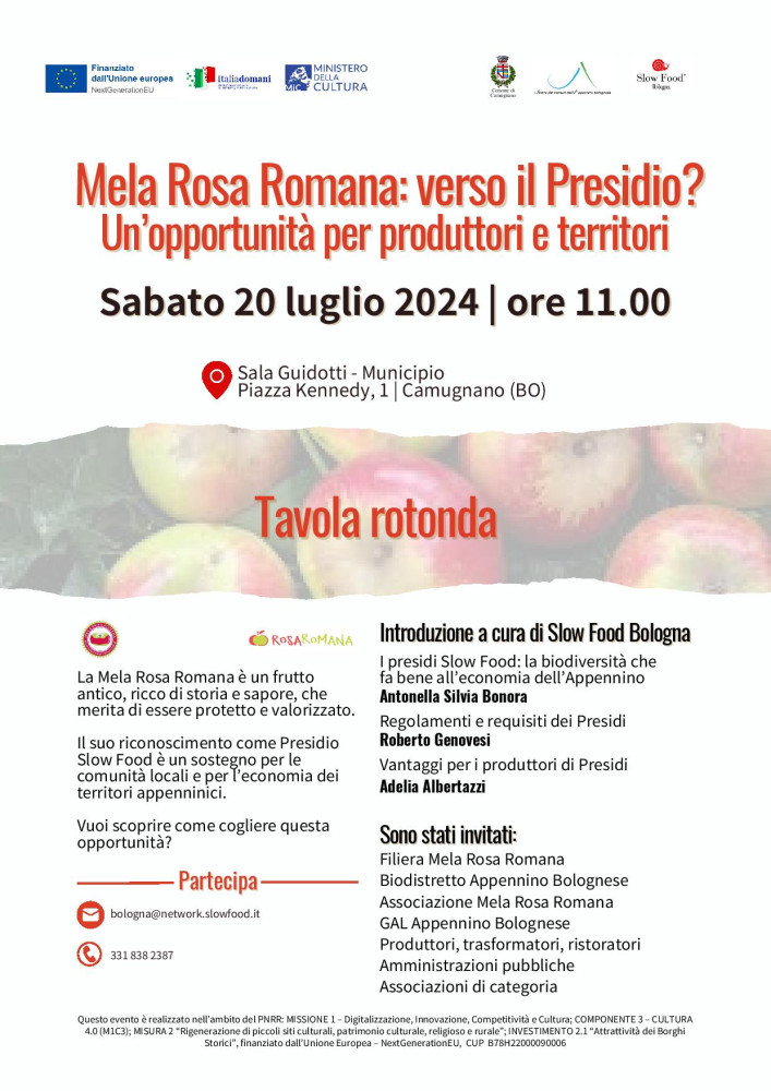 Il prossimo 20 luglio alle ore 11.00 Slow Food Bologna organizzerà un incontro in comune a Camugnano presso la sala Guidotti con i produttori della Mela Rosa Romana per esplorare la possibilità di realizzare un presidio.