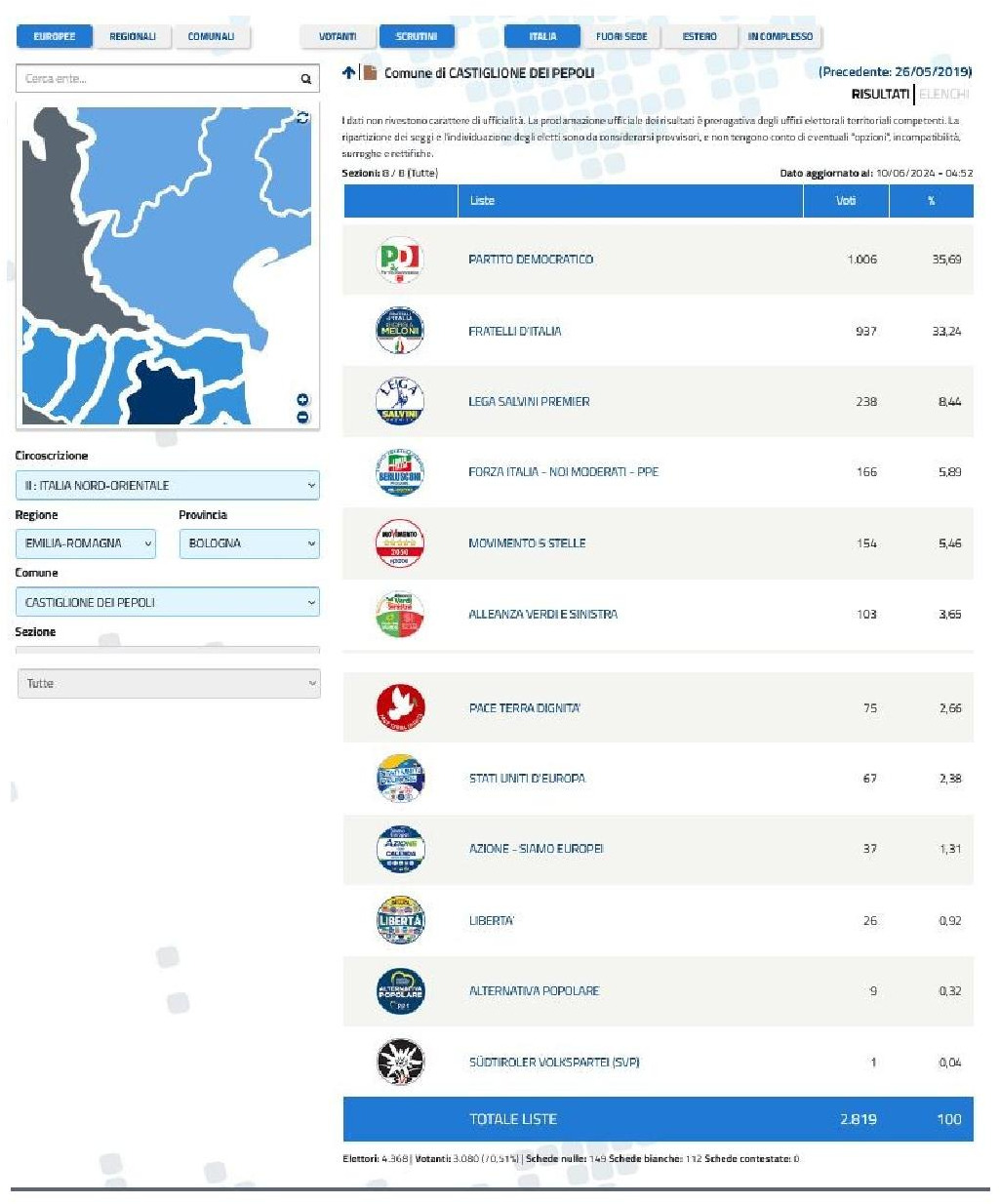 Elezioni europee 2024. Risultati del Comune di Castiglione dei Pepoli. In allegato tutti i dati.