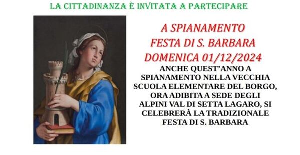 – 14.40 Santa Messa celebrata da Padre Bruno Scapini e processione per le vie del borgo con la statua di S. Barbara, patrona di Spianamento