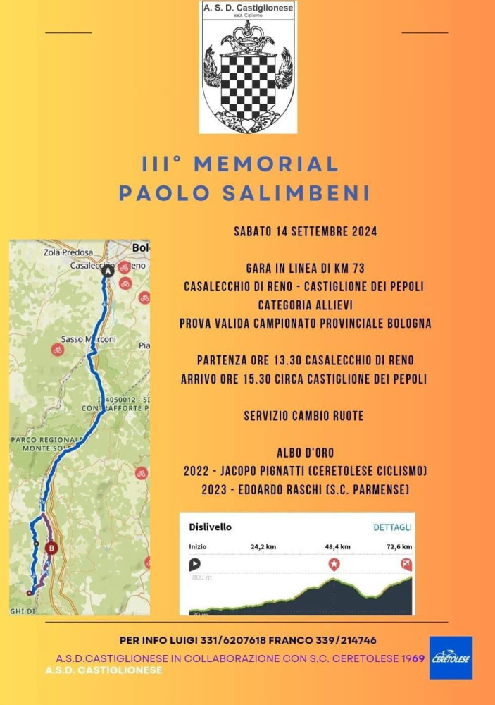 L’evento è la terza edizione intitolata al castiglionese Paolo Salimbeni, figura importante per il paese soprattutto per l’attività sportiva nel ciclismo. Molto attivo per lo sviluppo di questo settore che attraverso l’associazione locale ha costituito un importante punto di rifermento per i giovani atleti.