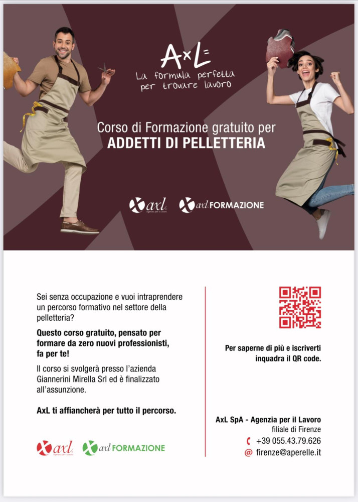 La formazione è finalizzata all’inserimento, con conseguente assunzione, nell’azienda stessa. Sarà un’opportunità di imparare direttamente da professionisti operanti nel settore da diversi anni, iniziando così un percorso di crescita in una solida realtà italiana. Il corso di formazione prevede l’insegnamento di nozioni teoriche e pratiche come le principali tecniche e mansioni della pelletteria: lavorazione e taglio professionale della pelle, cura e preparazione della materia prima, cucitura a macchina per la realizzazione di prodotti di pelletteria; senza tralasciare la preparazione teorica su materia prima, pellame e accessori metallici e la presentazione delle varie tecniche di lavorazione.