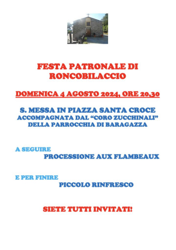 Roncobilaccio – “Festa Patronale di Roncobilaccio”. Alle ore 20.30 Santa messa in Piazza Santa Croce presieduta da Monsignor Elio Greselin, Vescovo Missionario Emerito in Mozambico. A seguire processione e piccolo rinfresco.