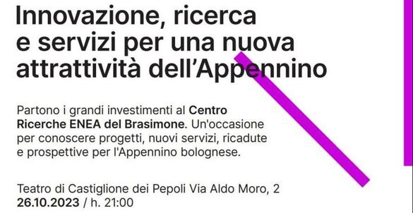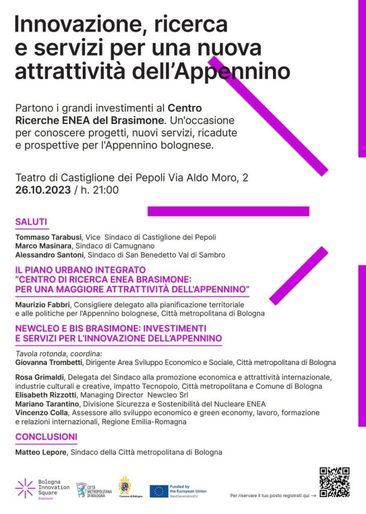 Castiglione dei Pepoli, giovedì 26 ottobre alle 21,00, presso il Teatro comunale sarà ospitata una serata riguardante i progetti e gli investimenti legati al Centro ENEA del Brasimone e le loro ricadute su tutto il nostro territorio.