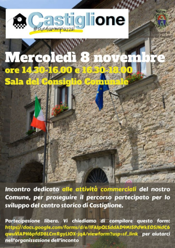 Mercoledì 8 novembre, presso la Sala del Consiglio, si terrà il primo di una serie di incontri aperti alla cittadinanza inerenti al percorso partecipato per lo sviluppo del centro storico di Castiglione.