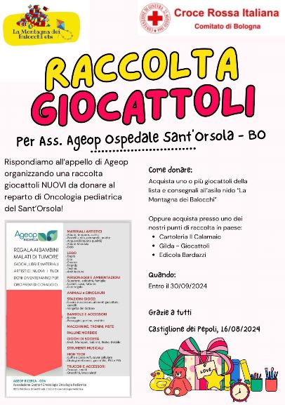 La Montagna dei Balocchi in collaborazione con la Croce Rossa rispondono all’appello di AGEOP organizzando la raccolta di giocattoli NUOVI da donare al reparto di Oncologia pediatrica del Sant’Orsola ‼‼