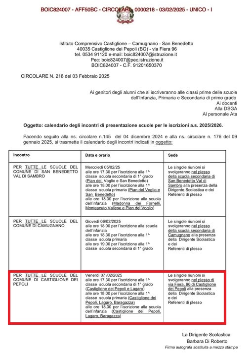 Dalle ore 17.00 Venerdì 07/02/2025 presso il plesso scolastico di Via Fiera 96 a Castiglione dei Pepoli è possibile partecipare ad un incontro di presentazione delle scuole di tutto il territorio comunale per le iscirizioni dell’anno scolastico 2025/2026. Vedi calendario in allegato.