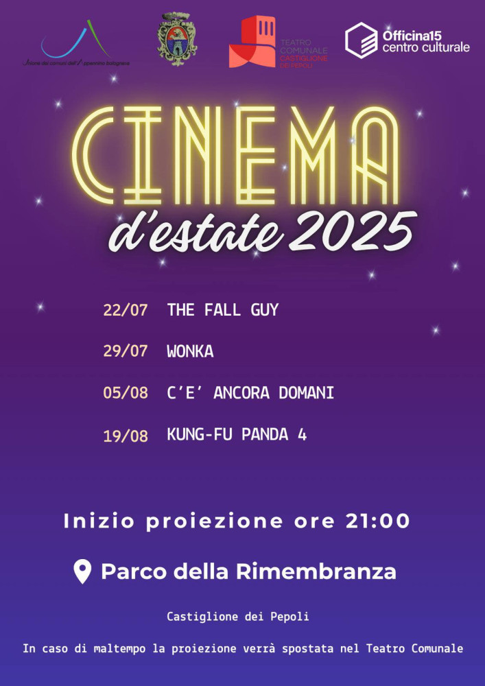 Un’occasione perfetta per incontrarsi, rilassarsi e vivere emozioni in compagnia. In caso di pioggia, le proiezioni si trasferiscono al Teatro Comunale!