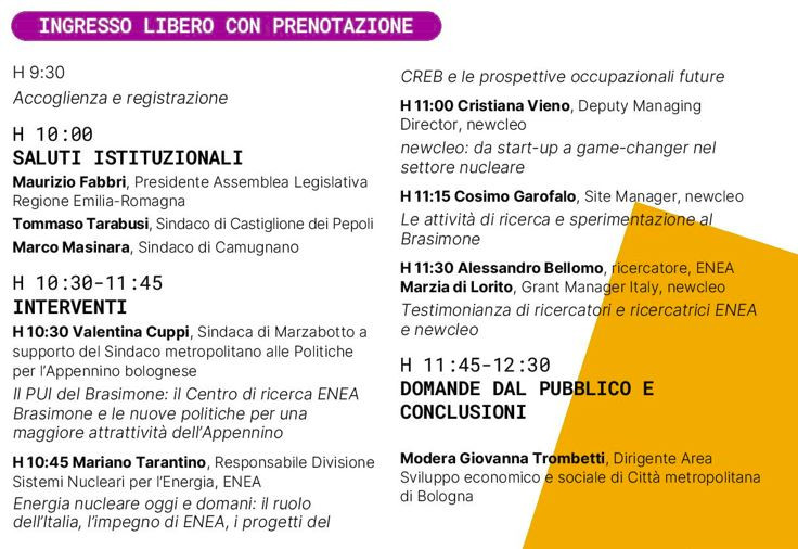 Il 29 maggio 2025, dalle 9:30 alle 12:30, il Teatro Comunale di Castiglione dei Pepoli ospiterà l’incontro “Energia e innovazione: dall’Appennino costruiamo il futuro – Con Enea e newcleo, ricerca e sviluppo per nuove opportunità“, un evento promosso da Bologna Innovation Square – Appennino e Comune di Castiglione dei Pepoli per presentare lo stato di avanzamento degli investimenti e dei progetti di ricerca di ENEA e newcleo sul territorio dell’Appennino bolognese.