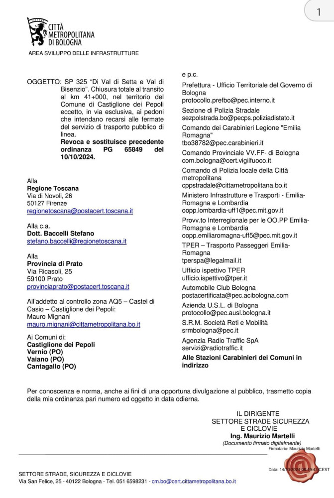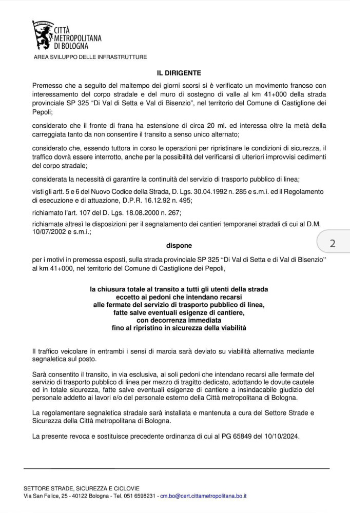Nuova ordinanza del 14/10/2024 della Città Metropolitana di Bologna che regola il transito degli utenti della strada. Chiusura totale del transito fatta eccezione per i pedoni che intendano recarsi alle fermate del servizio di trasporto pubblico di linea. Ordinanza in allegato.
