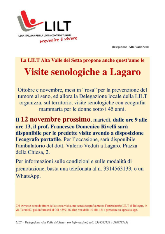 La LILT Alta Valle del Setta propone visite senologiche con ecografia mammaria per le donne sotto i 45 anni a Lagaro presso l’ambulatorio del Dott. Valerio Veduti.
