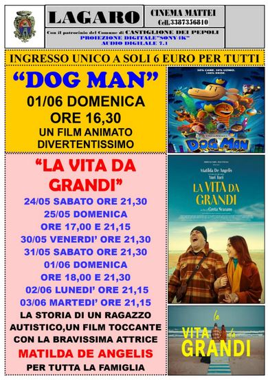 Lagaro di Castiglione dei Pepoli. Programmazione film al Cinema Mattei dal 24 maggio al 3 giugno in locandina