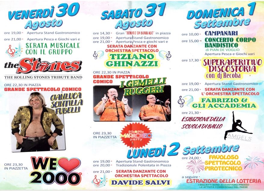 Gli organizzatori, i ragazzi della Pro Loco di Lagaro, avranno in piacere di ospitare venerdì 30 agosto la tribute Band dei Rolling Stones “The Stones” e il comico Gianluca Scintilla Fubelli che ci delizierà con uno simpatico spettacolo adatto a tutti. A seguire inizierà la serata giovani nella piazzetta con “WE LOVE 2000”.
