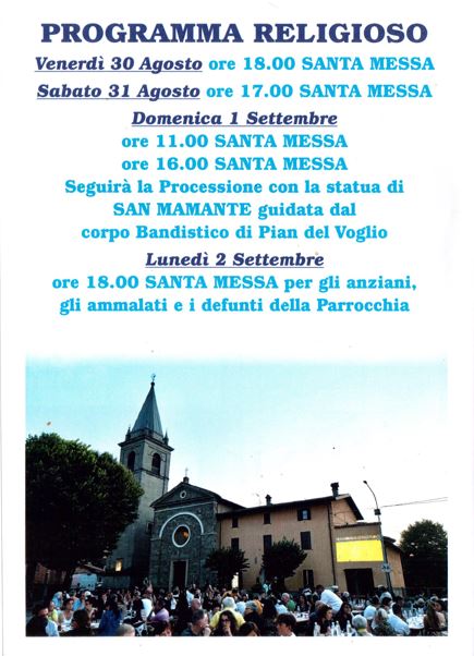 La domenica ci sarà come da tradizione la Santa Messa e  processione di San Mamante e a seguire l’aperitivo in Piazzetta.