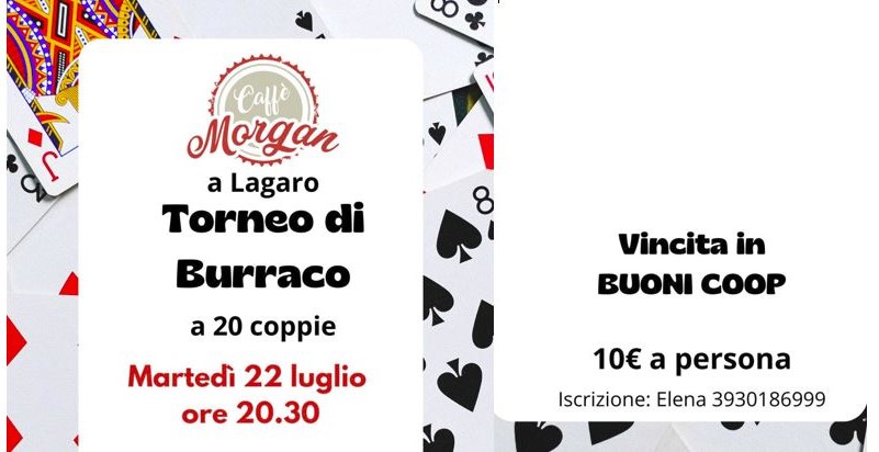 Martedì 22 luglio, al Caffè Morgan di Lagaro di Castiglione dei Pepoli: Torneo di Burraco a 20 coppie