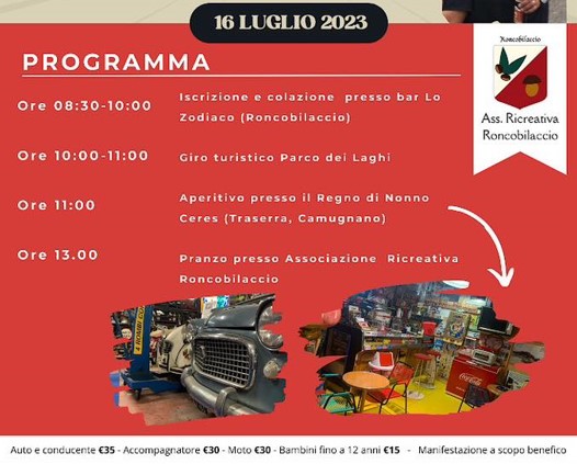 Anche quest’anno cercheremo di allietarvi in compagnia delle nostre Auto/Moto con un giro panoramico nelle nostre montagne, con un aperitivo al Regno di Nonno Ceres, luogo particolarmente interessante per gli appassionati di auto e con l’ottimo pranzo curato dalla Associazione ricreativa Roncobilaccio