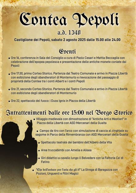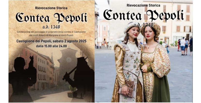 Contea Pepoli A.D. 1340’ è la rievocazione storica che punta a valorizzare la storia di Castiglione legata ai conti Pepoli, la famiglia che ha governato il feudo per oltre tre secoli, fino a tutto il Settecento, lasciando la sua impronta sul territorio. Il 1340 è l’anno in cui i Pepoli acquistano Castiglione e i territori circostanti dai Conti Alberti. Durante la rievocazione si metterà in scena il momento del passaggio di proprietà.