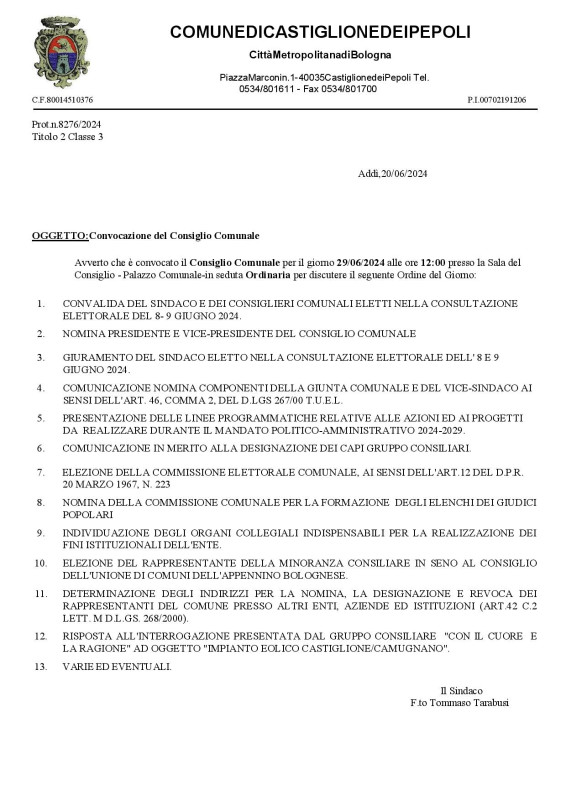 Sabato 29 giugno 2024 ore 12.00 è convocata la riunione del Consiglio Comunale del comune di Castiglione dei Pepoli