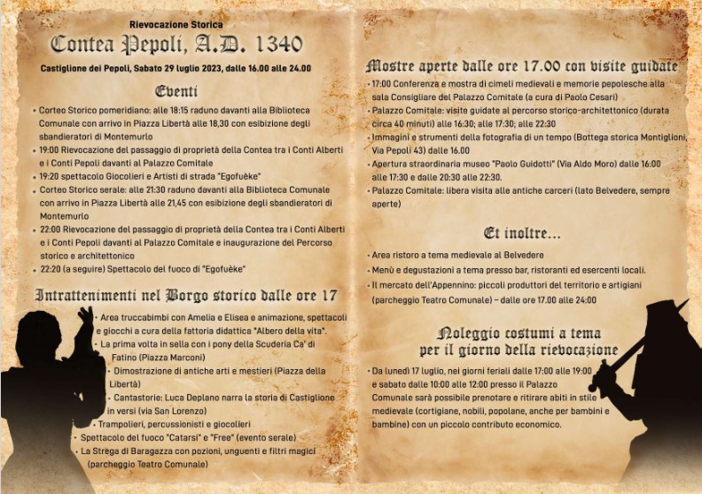 ‘Contea Pepoli A.D. 1340’ è la rievocazione storica, nata lo scorso anno, che punta a valorizzare la storia di Castiglione legata ai conti Pepoli, la famiglia che ha governato il feudo per oltre tre secoli, fino a tutto il Settecento, lasciando la sua impronta sul territorio.