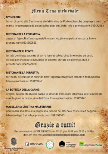 Oltre al corteo, sarà possibile assistere allo spettacolo degli sbandieratori, trampolieri e giocolieri di strada. Non mancheranno conferenze, momenti per bambini e l’enogastronomia: ogni locale si cimenterà in un menù medievale. E’ prevista anche la visita guidata al museo di Castiglione e a Palazzo Pepoli, imponente testimonianza della presenza dei conti in Appennino.