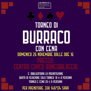 Domenica 26 novembre dalle ore 16.00 presso il Centro Civico di Roncobilaccio ”TORNEO DI BURRACO” con cena.
