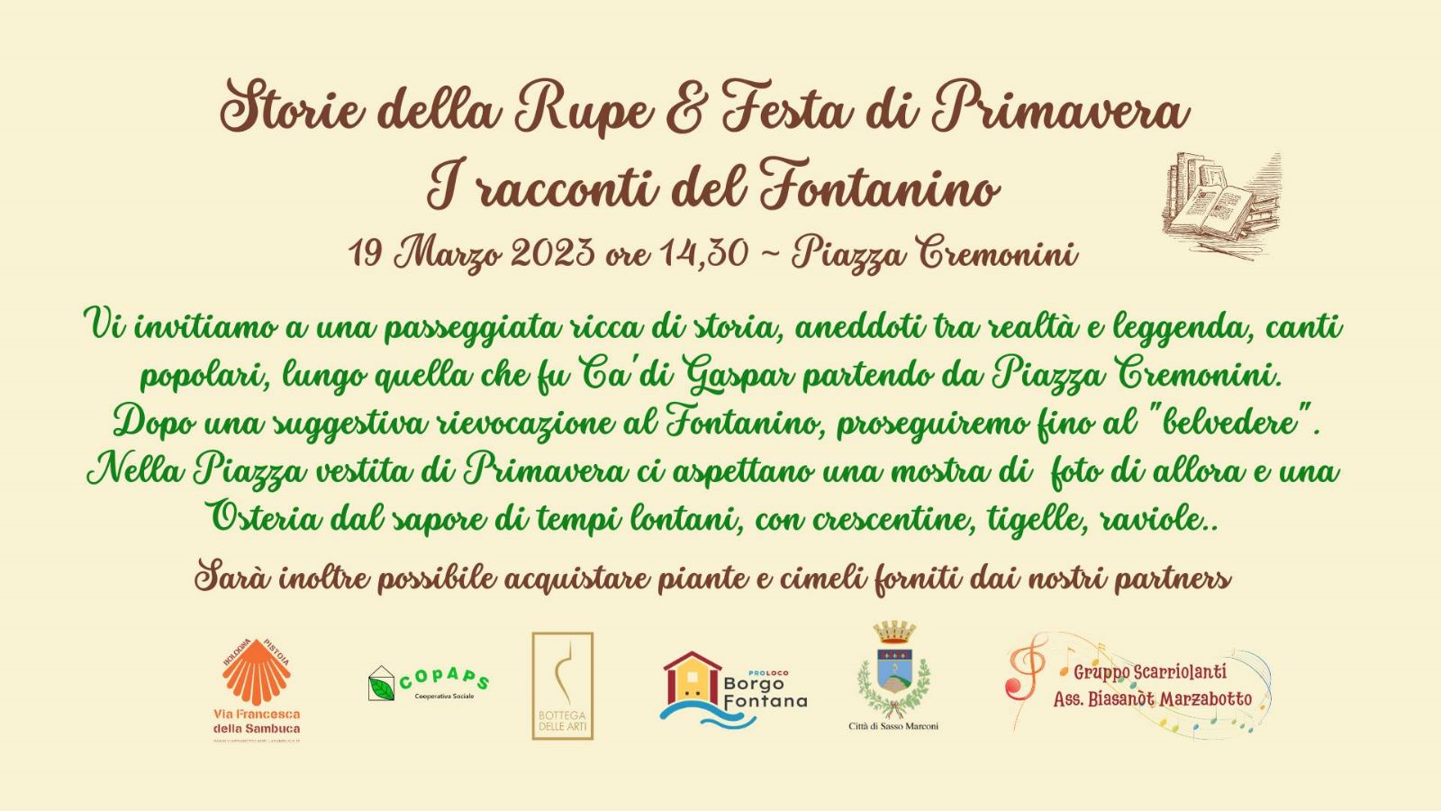 A Fontana di Sasso Marconi, Domenica 19 alle ore 14.30, Storie della Rupe & Festa di Primavera.