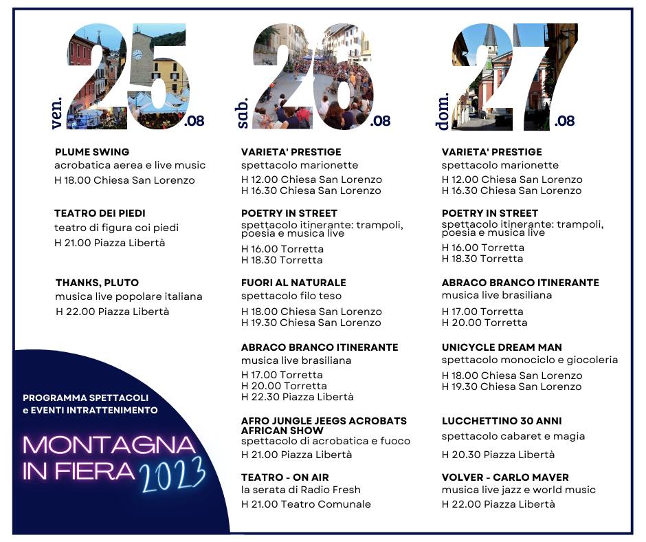 Il vicesindaco Tommaso Tarabusi dichiara: “Quest’anno siamo giunti alla 34° edizione di Montagna in fiera: personalmente è il 10° anno che mi occupo direttamente del coordinamento di questo importante evento per il territorio di Castiglione e non solo. Questa edizione si lascia alle spalle anni complessi come quelli del covid, ma la voglia di socializzare e trascorrere del tempo all’aperto magari scappando dal caldo delle città è forte e lo dimostra la grande adesione di espositori che ha raggiunto il numero più elevato degli ultimi anni. Gli spettacoli sono tanti e distribuiti nel corso delle tre giornate, sabato sera il teatro comunale ospiterà due importanti personaggi bolognesi: Vito e Patrizio Roversi che saranno intervistati dai conduttori di Radio Fresh. Oltre a ringraziare le attività che sostengono l’evento vorrei ringraziare alcune persone che storicamente mi hanno sempre aiutato insieme ai loro collaboratori come Sonia Villani per la parte commerciale e Alex Malaguti per la gestione impiantistica, così come alcuni rappresentanti di Ascom come Arianna Tortelli, Stefano Montiglioni ed altri.