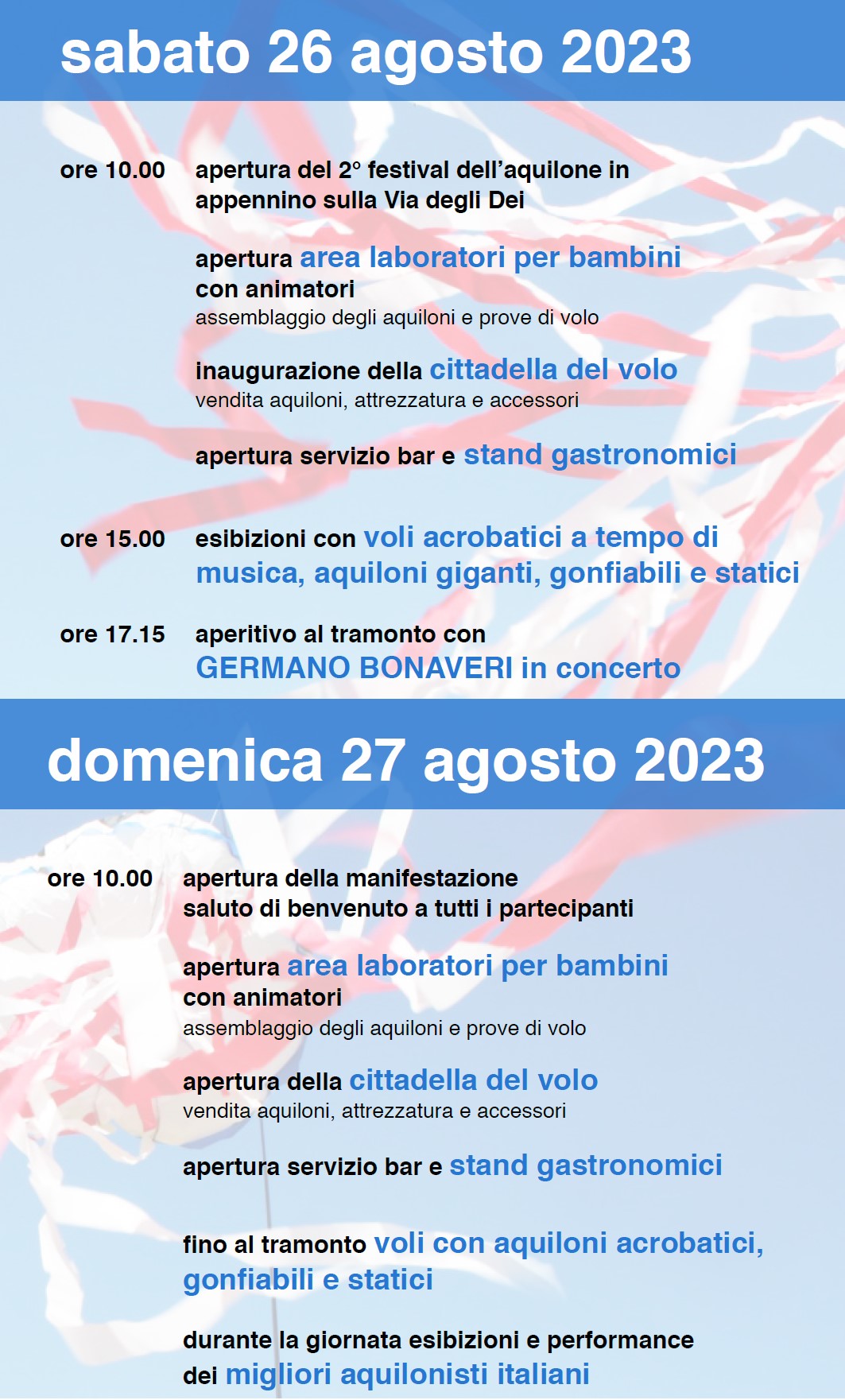 Il programma prevede due giornate di eventi dal mattino al tramonto con tante occasioni di divertimento, senza dimenticare i più piccoli ai quali verrà data la possibilità, grazie ad animatori esperti, di costruire un aquilone. Per tutta la durata dell’evento saranno presenti stand gastronomici e ristori ed un momento musicale sabato con un suggestivo concerto al tramonto del cantautore GERMANO BONAVERI.